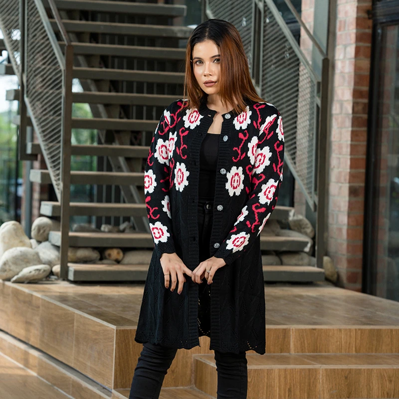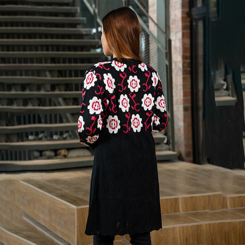Add elegance and warmth to your winter collection with the Floral Grace Winter Cardigan. This beautifully designed piece features charming floral patterns in red and white over a classic black base — perfect for bringing a touch of sophistication to your everyday style.
