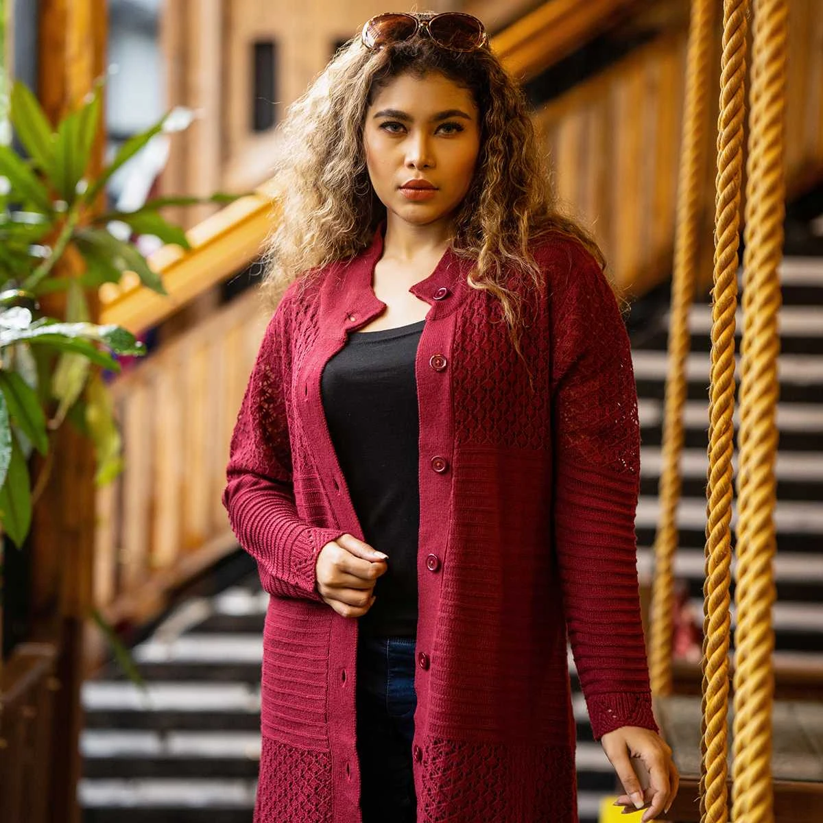 Stay warm and stylish with this long maroon knit cardigan, crafted from high-quality Acrylic Wool. The textured design and button-down front add a touch of elegance to your everyday wear. Its soft, breathable fabric ensures comfort throughout the day — perfect for casual outings, office wear, or chilly evenings.