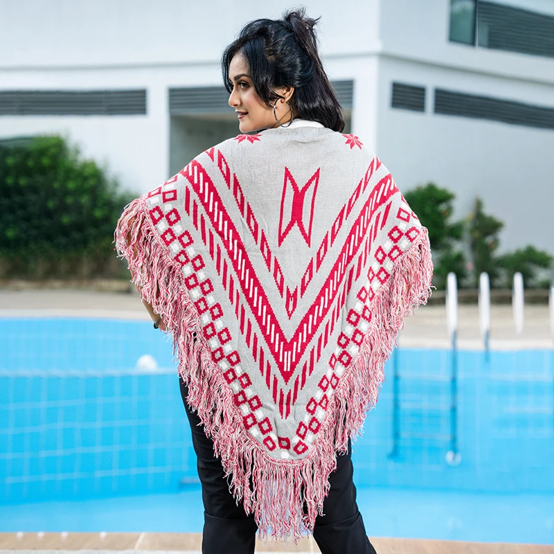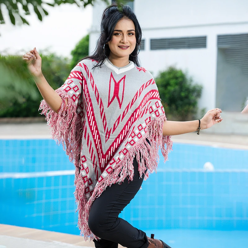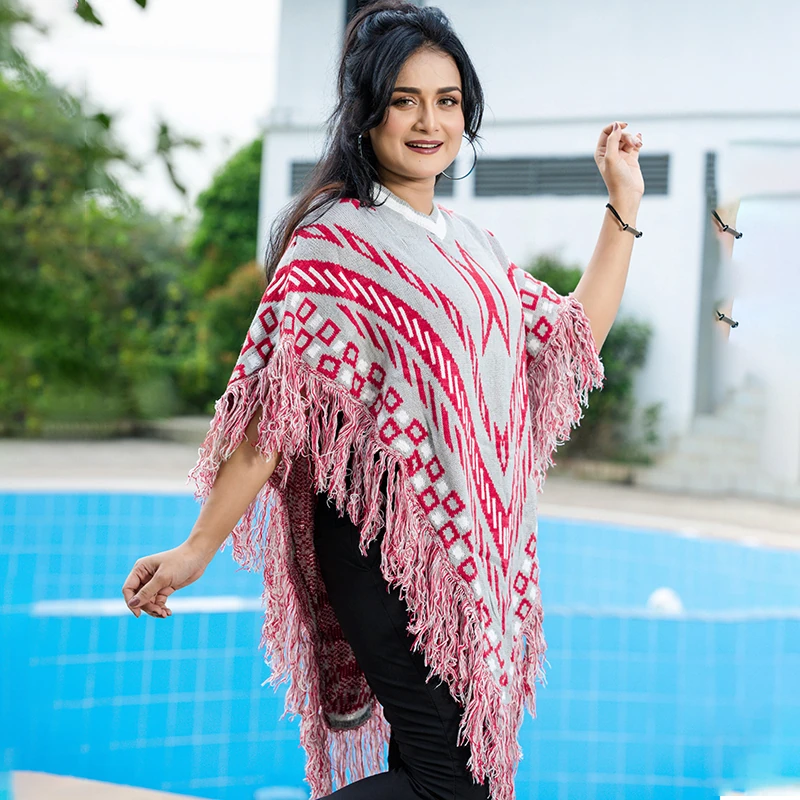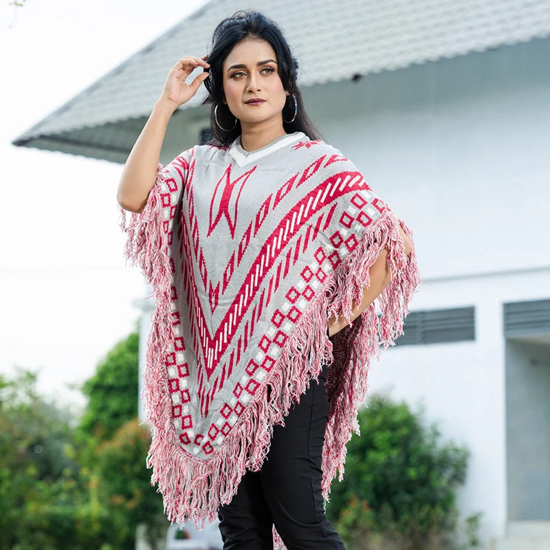 Show off your bold yet elegant style with this grey and red patterned knit poncho, a perfect blend of warmth, comfort, and sophistication. The tribal-inspired geometric design, V-neckline, and tassel fringe border make it a standout winter layer. Soft, breathable, and lightweight — this poncho adds instant flair to any outfit, whether you’re dressing for casual outings or cozy gatherings.