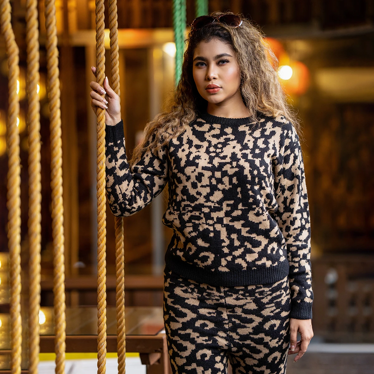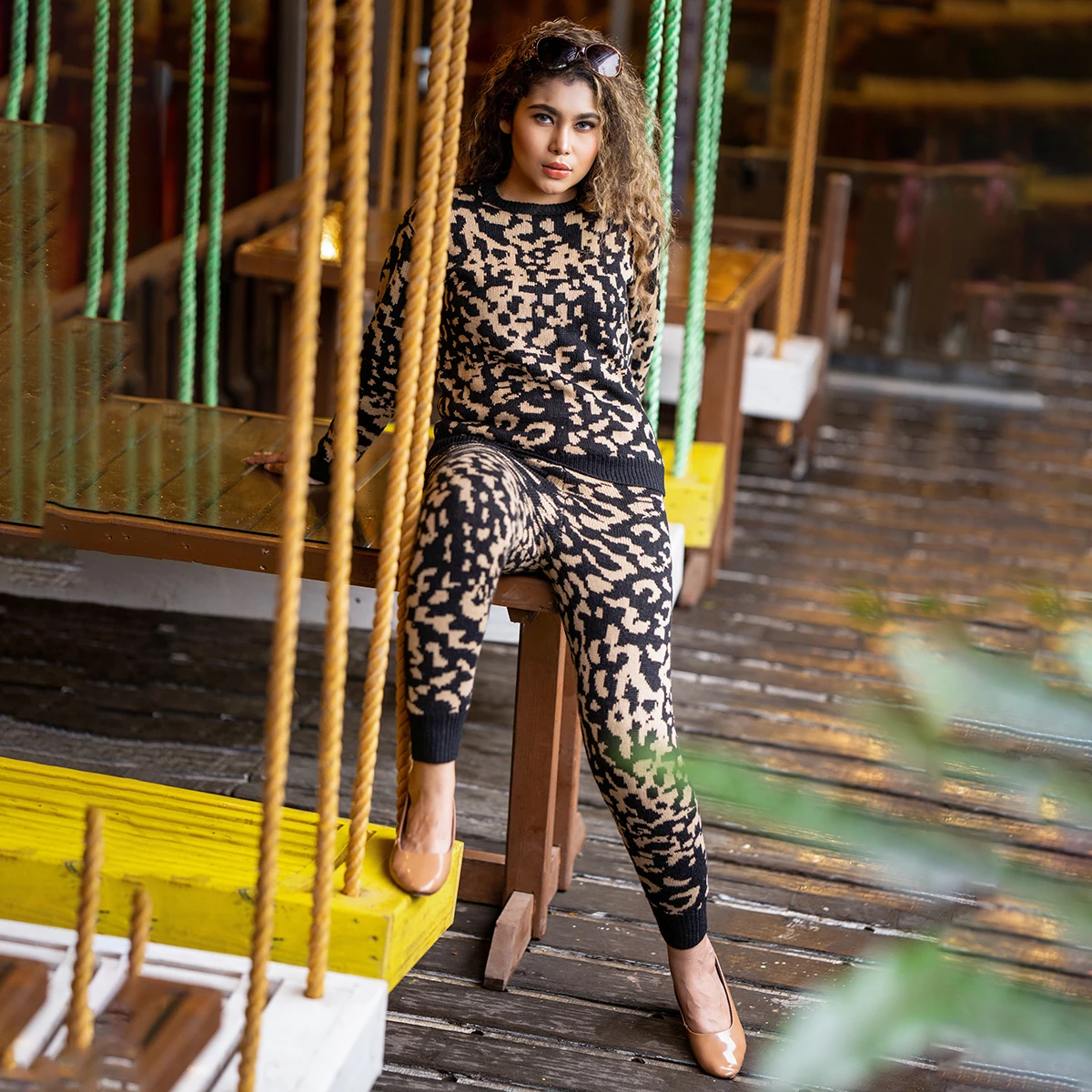 Stay cozy and stylish this winter with our Leopard Knit Co-ord Set. Made from soft, stretchable fabric, this two-piece outfit features a trendy black-and-beige animal print design. Perfect for casual outings, coffee dates, or relaxed evenings — it’s the perfect blend of comfort and bold fashion. Pair it with nude heels or boots for a chic winter-ready look.