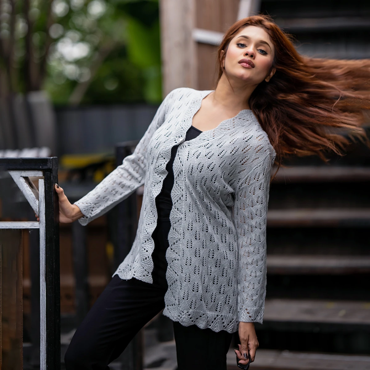 Elevate your look with this elegant light grey open-knit cardigan, crafted for comfort and sophistication. The beautiful V-neck design with scalloped edges and long full sleeves create a graceful silhouette, making it a perfect layering piece for any season. Designed with intricate leaf-pattern knitting and a single pearl-style button at the neckline — it’s both modern and timeless.