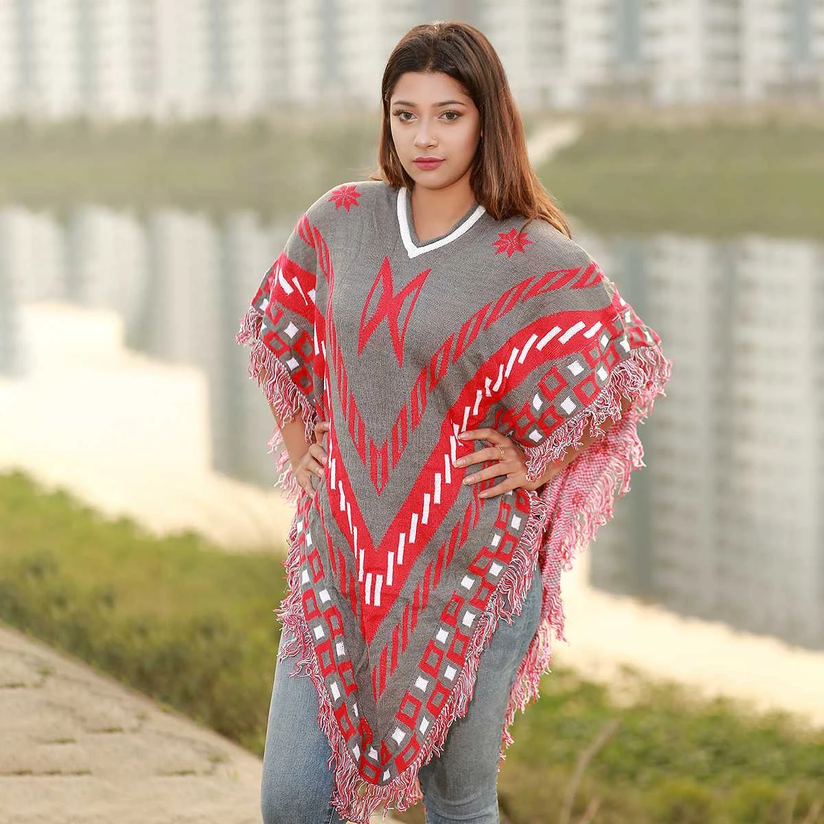 Add a bold touch to your winter style with this grey and red geometric-pattern poncho. Designed with a modern V-neckline, eye-catching tribal-inspired prints, and soft fringed borders, it combines comfort with a statement look. The free-flowing fit makes it ideal for layering over tops or sweaters — giving you a warm, cozy, and effortlessly fashionable vibe for any occasion.